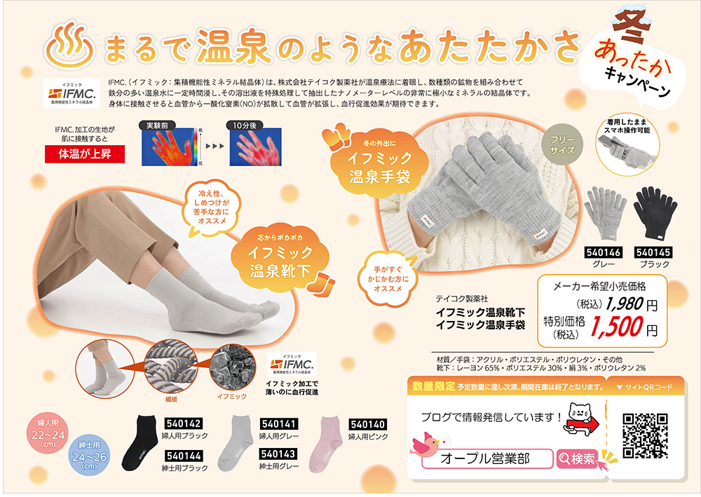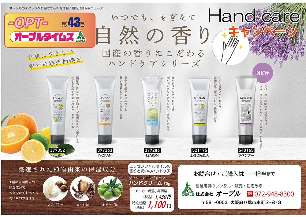 1月のお得情報:もぎたて自然の香り「デイリーアロマジャパンハンドクリーム」とあったかグッズのご紹介 2026/01/14 1月のおすすめ商品のご案内お得な1月キャンペーン第43号はいつでも、もぎたて自然の香り「デイリーアロマジャパンハンドクリーム」のご紹介です✨お肌にやさしい無添加処方となっております!5種類の香りからお選びいただけます🍊 裏面は冬のあったかキャンペーン「イフミック温泉靴下」と「イフミック温泉手袋」について掲載しております! 詳細はオープルの担当までお問い合わせください✨ 関連記事 - Related Posts - 高齢者の方、足にお悩みのある方の靴をプレゼントに!あゆみシューズ年末年始割引キャンペーン 1月お得情報:足先の冷え対策におすすめのぽかぽかグッズ特集! 塗るだけで夏涼しく冬暖かいアドグリーンコート 万能洗剤ハキュートの威力 ③お風呂編 最新記事 - New Posts - 1月のお得情報:もぎたて自然の香り「デイリーアロマジャパンハンドクリーム」とあったかグッズのご紹介 2026年 新春のご挨拶 12月のお得情報:USBにつないですぐにほかほか!電熱クッション「USBソクホカクッション プラス」のご紹介 【第2弾】オープルの住まいのリフォームのご紹介!オープル特別価格✨ - Comments - コメントをキャンセルメールアドレスが公開されることはありません。 ※ が付いている欄は必須項目ですコメント ※名前 ※ メール ※ サイト 次回のコメントで使用するためブラウザーに自分の名前、メールアドレス、サイトを保存する。reCaptcha の認証期間が終了しました。ページを再読み込みしてください。 Δ